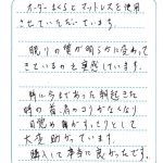 2020年2月5日 / 最終更新日 : 2023年3月5日 yuminkan オーダー枕 劇的に睡眠が変わり久しぶりに熟睡できました 枕、マットレス、パシーマを購入させていただきました。 家族それぞれに合ったものを親身になって提案してくださり、一同大満足です。 購入したその日から劇的に睡眠が変わり、久しぶりに熟睡できました。 普段人見知りの激しい娘も、 […]
